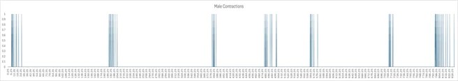 The videos were slowed down to .25 times for more accurate time-stamping in Excel. Peak contractions were each marked with a 1 and all other time instances are marked with a 0, which create decent. The estimated margin of error is + or -.25 seconds for time marks. The margin of error for the number of contractions is estimated to be + or – 3, which will also affect orgasm length. Use of the bulbocavernosus muscle was used for a few contractions for instances where the butt was clenched or in poor lighting, hiding visibility of the anus. The genital sensation perception that usually occurs with orgasm (except in anhedonic orgasm, some spinal cord injuries) usually starts a few seconds before the first contractions and subsides in the last few contractions. The margin of error in terms of sensation perception is estimated to be + or – 5 seconds.