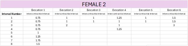 Female 2 had the shortest evocation period (first contraction to last of series) and the shortest time between evocations (e.g., 39.25 seconds). Interestingly, the time between orgasms increased with each successive one, a trend not observed in Female 1. Even if Female 2 could maintain this rate of evocation, considering the potential for increased neural inhibition with each session, her total evocation length might still not surpass that of Male or Female 1.