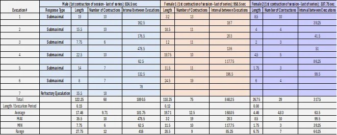 The male also displayed the greatest variation in both contraction length (7.75 to 35.5 seconds) and number of contractions (6 to 18). The refractory ejaculatory orgasm involved a higher number of contractions, which were visibly more powerful than the preceding submaximal threshold responses.