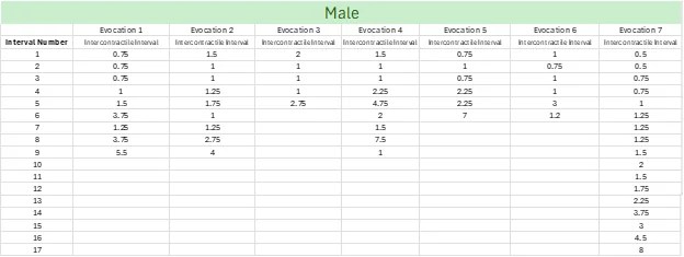 - Male: (6.4 – 31.3 seconds; 8-18 contractions)