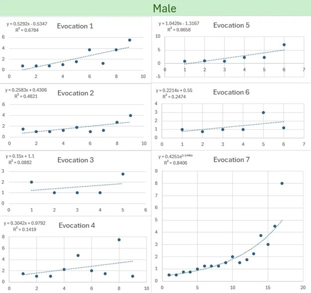 I’m currently developing a novel neurophysiological model that addresses the emergence of micro-variability within each evocation of the stereotyped macro-level view. Recent consultations with leading experts in the human and animal urogenital reflex revealed that it is unknown why the urogenital reflex presents the way it does and why there is such variability. While the urogenital reflex is generally stereotyped, particularly in the initial contractions, stochastic dynamics within spinal and network potentiation in neural networks within the sacral spinal cord, bottom-up stimulus processing, and top-down processing could explain such randomness. Overarching generalizations like “orgasms or urogenital correlates tend to become shorter, longer, weaker, stronger, etc., with each evocation” over time are not helpful when modeling the stochastic reality. The low r-squared values observed underscore the randomness of the data and its poor fit to any trendline supporting these generalizations.
