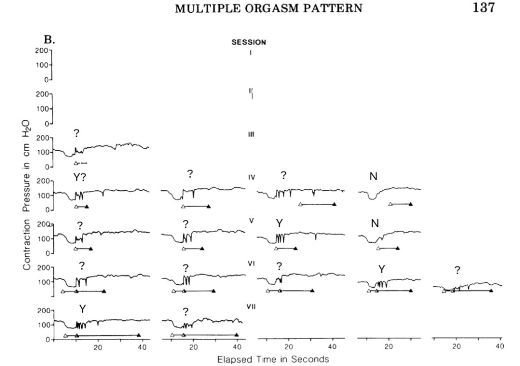 Bohlen et al. (1982) used an inflatable probe, so the contractions show decreases in pressure rather than increases, which is why the period after orgasm has higher pressure than the regions during orgasm. Like Female 2 in the study, some reported orgasms only had a few contractions, yet a few are more stereotyped like Session VII, evocation 1.