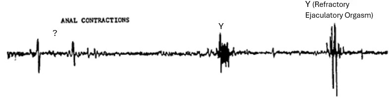 In addition to highlighting individual variability, the findings challenge the prevailing assumption of unlimited orgasmic capacity, particularly in women. Contrary to the assertions of authors such as Mary Sherley and Masters & Johnson, our study demonstrates that the human body has physiological limitations regarding the frequency and proximity of orgasms. Female 2 had to wait some time between orgasms and the interorgasmic interval. Seven evocations in the male would also be unexpected by writers like Masters and Johnson (1966) who believed that the males of Robbin’s and Jensen’s study were faking the contractions. Several males in my survey of pornographic content had ruined orgasms 10 seconds or less apart, but they could not be included because of the focus on the penis. Many just showed multiple instances of squirting or a male having a shaking response largely associated with the Aneros community or instances of prostate milking. This suggests that they are having something else they are calling an orgasm, such as any release, any peaking, pleasure, etc. In porn video analysis from sites reporting to only show female multiple orgasms, I found that females report orgasms ten, twenty, or even hundred times, yet show not evocations of the urogenital reflex. While the demand for multi-orgasm content in the adult entertainment industry might suggest otherwise, our analysis did not identify instances of significantly more than seven consecutive orgasms in either sex. Perhaps I missed one. I certainly did not watch all the porn in the world. If so, please DM me.
