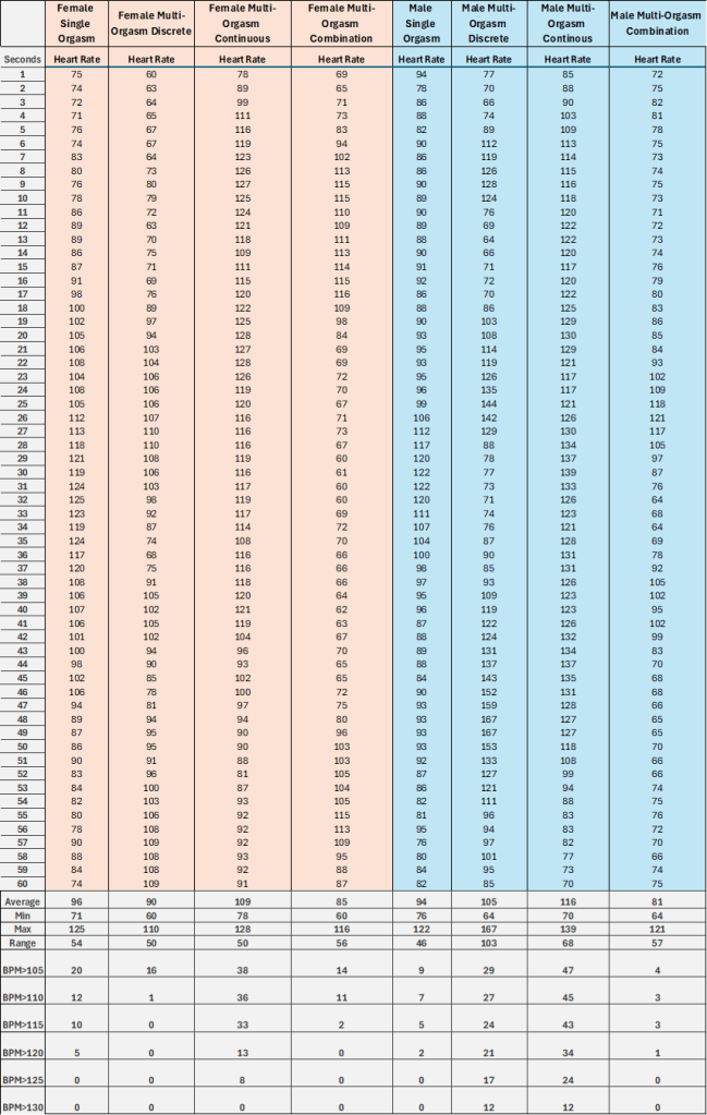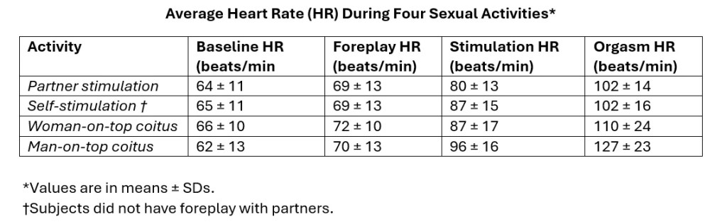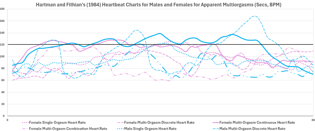 - Alzate, Useche, and Villegas (1989), using heart rate as an indicator of orgasm, reported values barely above 100 bpm, falling short of Hartman and Fithian’s approximately 120 bpm threshold.