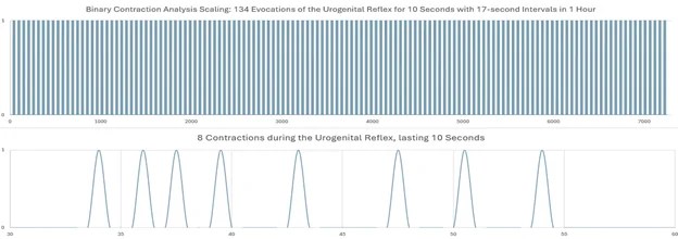 The results of the first binary contraction analysis (MultipleOs, 2024) are in stark contrast with reported figure of 134 orgasms claimed in the Hartman-Fithian research. In an analysis of publicly available adult content, documented examples of urogenital contractions indicating orgasm have not exceeded six to seven occurrences per individual session (MultipleOs, 2024). In the binary contraction analysis, neither female had 27 second intervals, and these are stand-out record cases. In addition, Female 2, who had the shortest interval between evocations of the urogenital reflex, a gold-standard correlate of orgasm, had intervals that consistently increased overtime from 39.25 seconds to 99.5 seconds. Because the urogenital reflex can also occur in high plateau phase in is possible some of these instances are not orgasm but high plateau phase evocations. The large disparity between these documented cases and Hartman and Fithian’s findings further calls into question the validity of their measurements and conclusions.