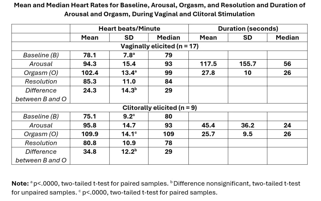 The confounding factors lead the authors to commit a causal attribution fallacy. The same heart rate can come from many different causes, not just orgasm. What counts as “elevated” heart rate varies by individual, and the 120 BPM threshold is arbitrary. Hartman and Fithian can’t reliably work backwards from heart rate to determine cause was orgasm or not. Different people can have different heart rate responses to orgasm. For example, consider the variability observed by other researchers investigating heart rate during self-reported orgasms in the tables below.