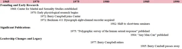 “In 1970, some rudimentary physiological research began. In 1972, the late Berry Campbell, a research physiologist from the University of California Medical School at Irvine, joined the Center quarter-time as part of his teaching load. Campbell initially used borrowed equipment, but the Center itself eventually purchased a Beckman R411 Dynograph eight-channel recorder. To support the research, Hartman and Fithian offered short-term seminars on sexual therapy in most of the major cities in the United States. The first seminar was held for about 20 people, but the numbers built up to as many as 600 in such major centers as New York City. Short-term seminars continued to be held until 1982, and in some years more than two dozen such seminars were held. The money earned from them not only allowed the continuation of the research but also the upgrading and purchase of more and newer research equipment, some made specifically for the Center. Hartman and Fithian not only used the laboratory for their own research, but they allowed a number of other professionals access to it as well” (p. 106).