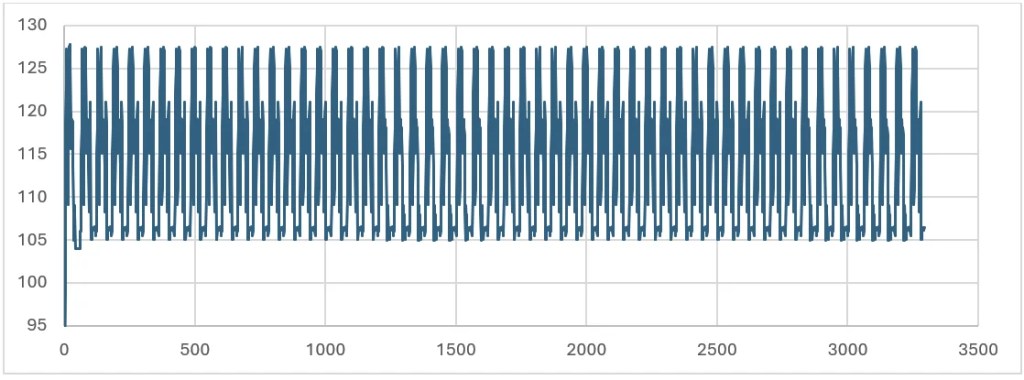 Let’s start with what Hartman and Fithian might have seen on their Beckman dynograph receipt paper. To recreate the printout, I have took the minute data and assumed that there might be some continuous and some discreet in the mix. I scaled the female continuous orgasms examples to equal 134 orgasms in an hour. Although these could be from entirely different people, it could be a good approximation of the printout that Hartman and Fithian (1984) saw. If each minute of print was 10 inches, then the data scroll could be as long as 50 feet, which would be a lot to represent. If 134 one-minute graphs were represented, assuming the size of the images in the Appendix, then 45 pages would be dedicated to this data. Certainly, they wouldn’t want to photocopy a mile-long receipt of data for publication, but it would have been certainly nice to see. Below is the Hartman and Fithian recreated receipt showing 134 peaks in heartbeat.